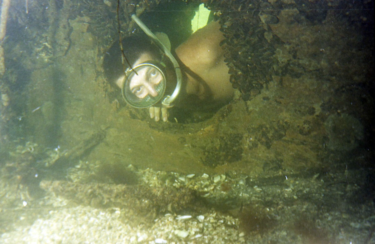 Вова выглядывает через отверстие в днище боевой рубки, которая находиться на отмели в Тендровском заливе. Именно через это отверстие вытаскивали штурвал. Так как отверстие было слишком мало и штурвал через него не проходил - его распилили на части. Пилил Дмитрий Криницкий. Подробнее об этом: