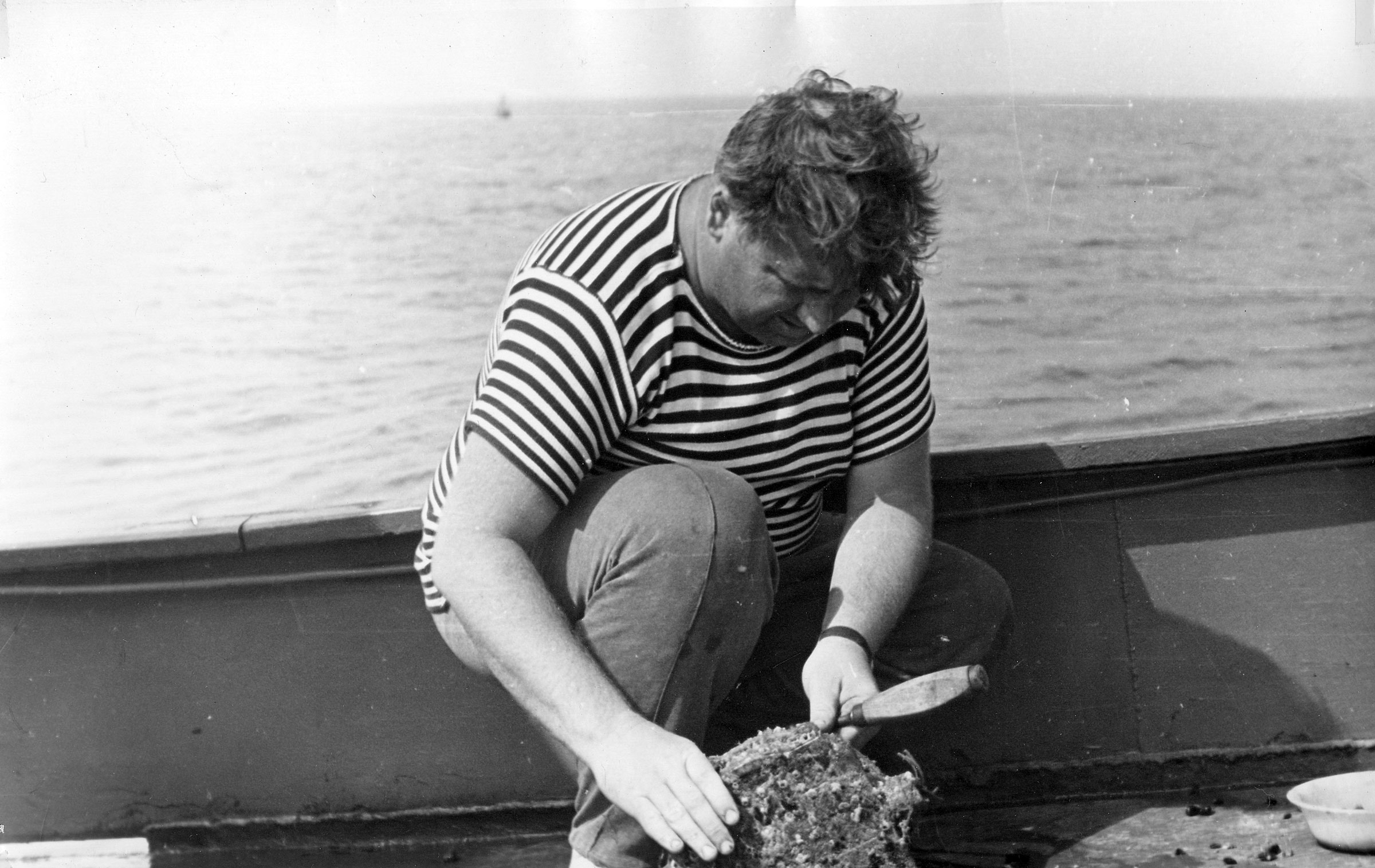 Очищает какую-то находку, поднятую со дна.