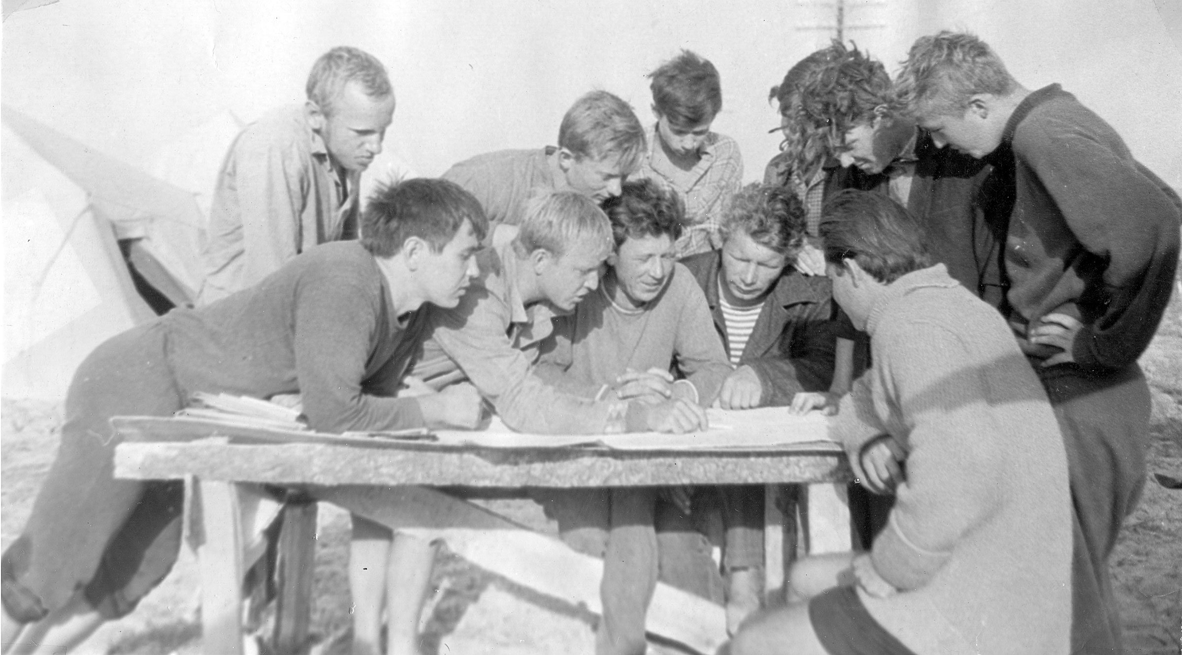 Слева-направо: (?) (облокотился на стол парень в спортивном костюме), Владимир Шкуратовский (что-то показывает на карте, светловолосый ), Михаил Коновалов (сидит в центре, темные волосы), Анатолий Корчагин (сидит справа от Коновалова, в тельняшке). Второй справа-налево стоит (кудрявый) — Олег Герасимов. Справа сидит (в свитере) — Анатолий Копыченко. Остальных не знаю.